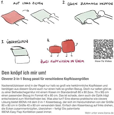 EASY-FLAP-KONFEKTION: Bettwäsche mit praktischem Reißverschluss. Die patentierte Ibena Esay-Flap-Konfektion, auch Europakonfektion genannt, macht aus dem Standart-Kopfkissenbezug 80×80 cm mit wenigen Handgriffen einen 40×80 cm Kopfkissenbezug.